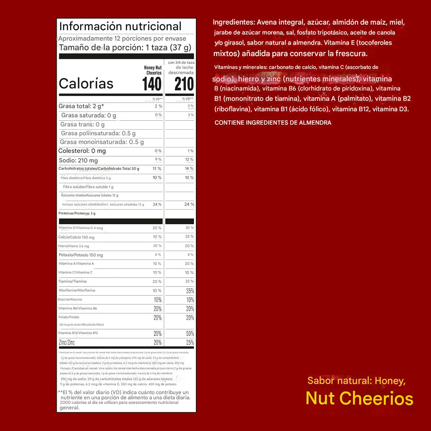 Avena integral, azúcar, almidón de maíz, miel, jarabe de azúcar morena, sal, fosfato tripotásico, aceite de canola y/o girasol, sabor natural de almendra. Vitamina E (tocoferoles mixtos) agregada para preservar la frescura. Vitaminas y minerales: Carbonato de calcio, vitamina C (ascorbato de sodio), hierro y zinc (nutrientes minerales), vitamina A B (niacinamida), vitamina B6 (clorhidrato de piridoxina), vitamina B1 (mononitrato de tiamina), vitamina A (palmitato), vitamina B2 (riboflavina), vitamina A B (ácido fólico), vitamina B12, vitamina D3.
