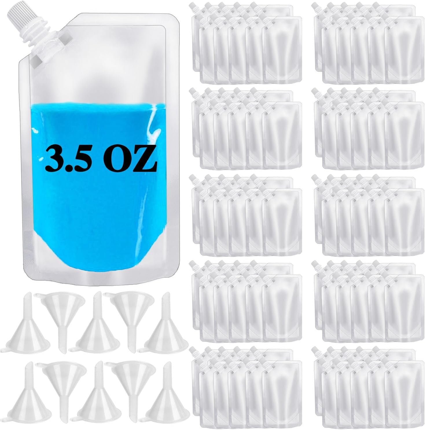- Cantidad suficiente: el paquete incluye 100 bolsas de plástico reutilizables para bebidas y 10 embudos, cantidad suficiente y combinación razonable, ya sea para uso personal o reuniones familiares, estos productos pueden satisfacer tus necesidades diarias de uso y reemplazo