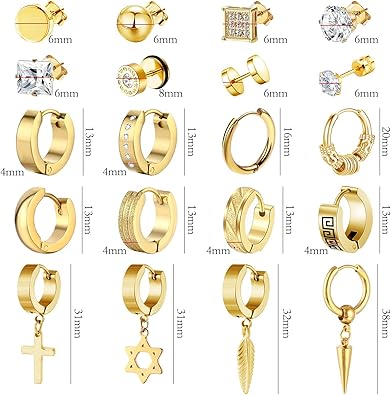 El paquete incluye: recibirás 20 pares de aretes de acero inoxidable para hombre, incluyendo 5 pares de aretes de oro para hombre con circonita cúbica, 3 pares de aretes