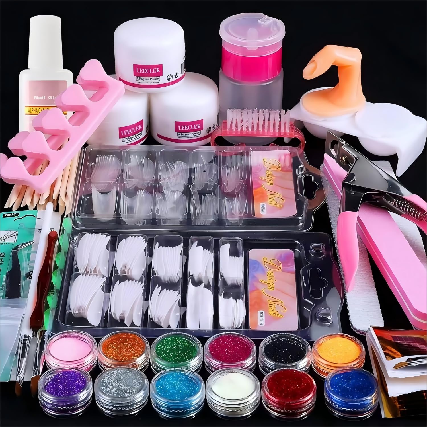Muchos kits traen varios polvos acrílicos de colores, purpurinas y decoraciones.
