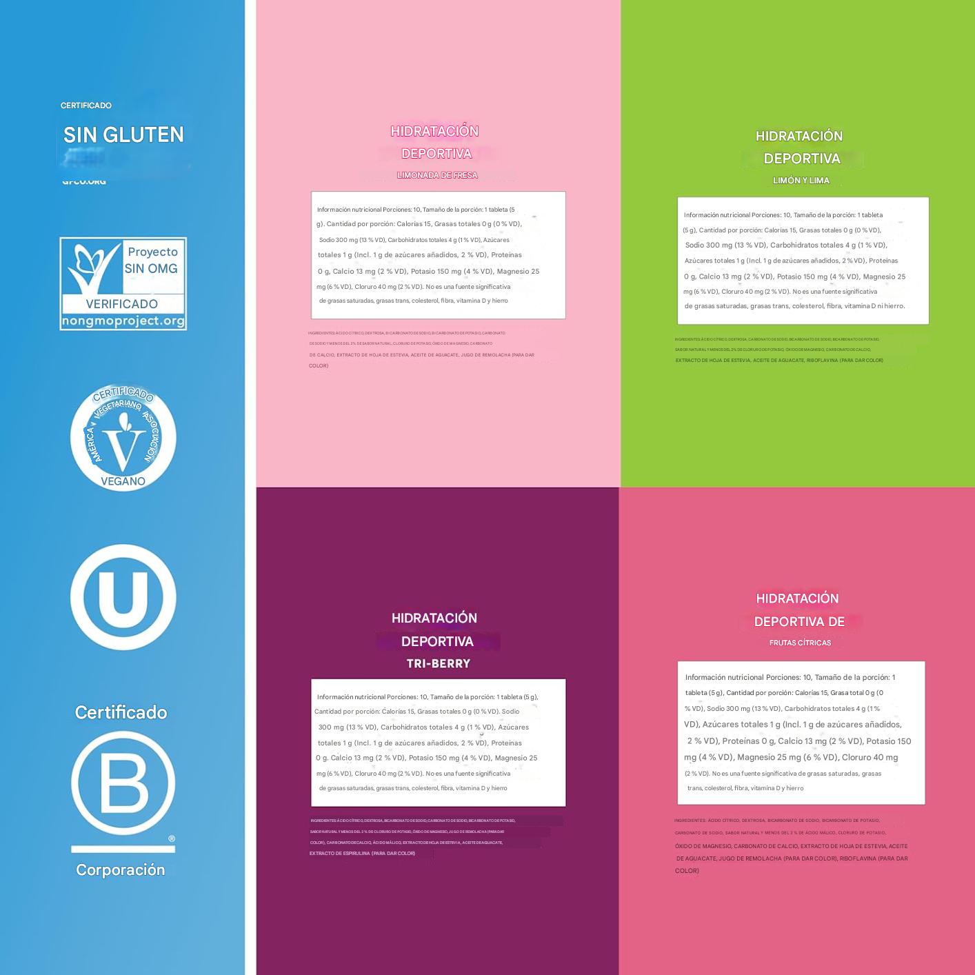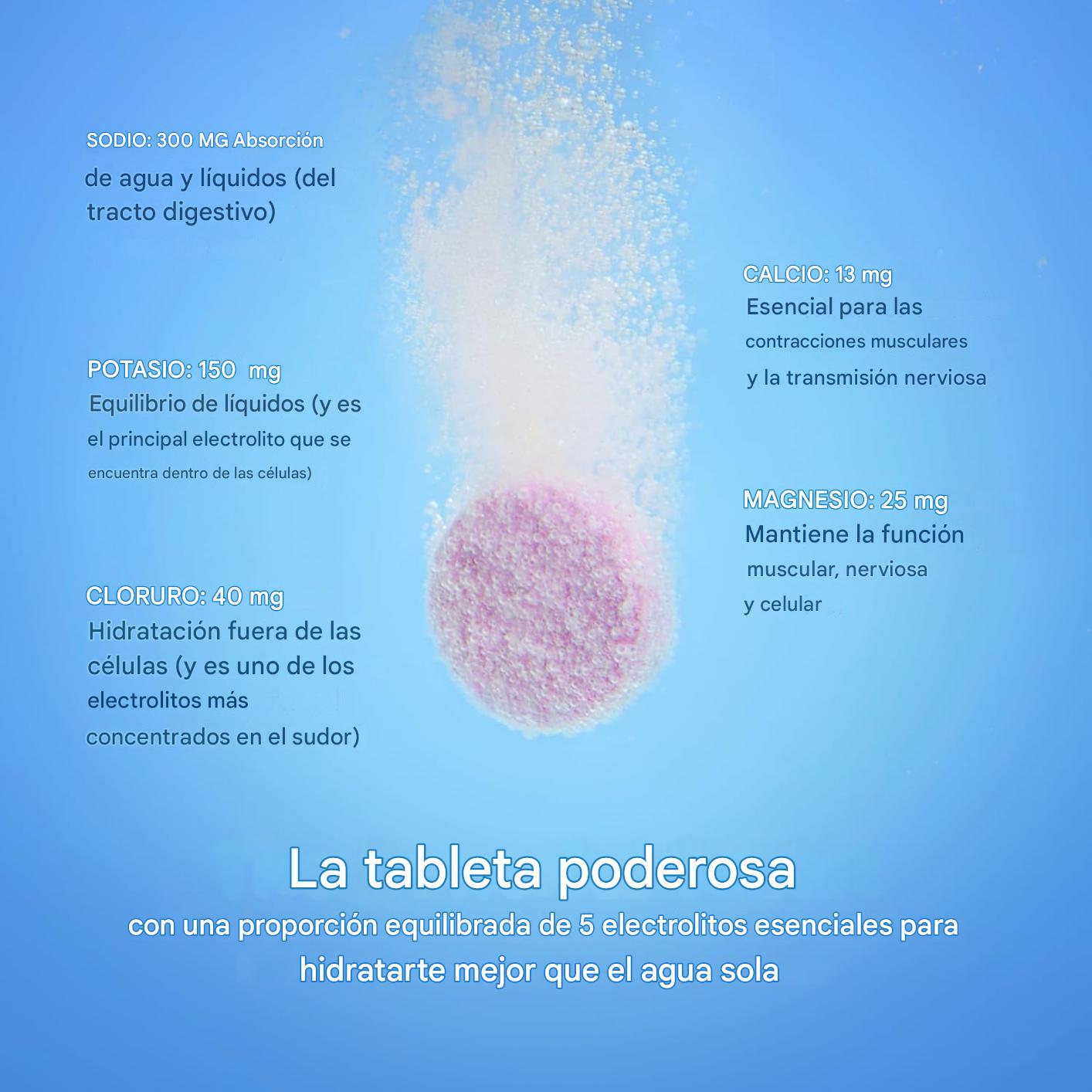 Ingredientes activos: sodio (bicarbonato y carbonato), potasio (bicarbonato y cloruro), magnesio (óxido), calcio (carbonato), otros ingredientes: ácido cítrico, dextrosa, sabores naturales, extracto de hoja de stevia, mezcla de extracto de arroz, aceite de avoco, remolacha, remolacha Jugo en polvo (para color), riboflavina (para color), espirulina (para color), ácido málico
