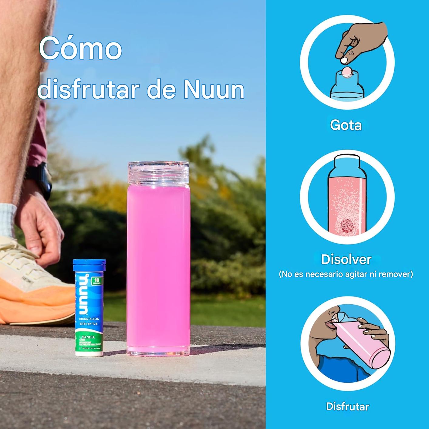 Nuun Sport Fue Diseñado por Atletas, Para Atletas. El ProductO de Bebida Deportiva Insignia de Nuun Hydration Tiene Cinco Electrolitos esenciales y Reemplaza lo que se SE Pierde Cuando Suda Durante el Ejercio. Termine su Abrenamiente Fuerte, Hidratado y Reponido.